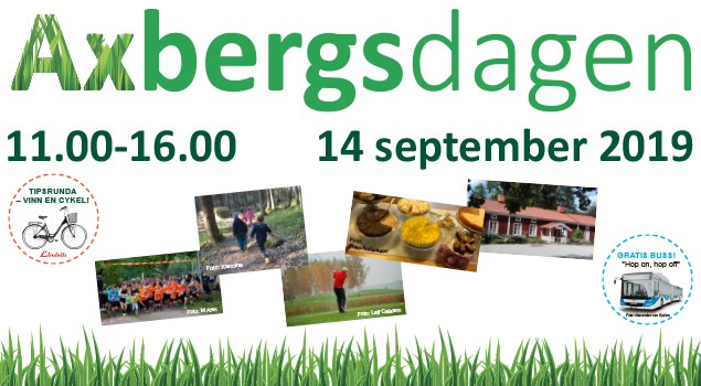 Det är hög tid för en Axbergsdag! Ett 20-tal föreningar samordnade av Axbergs områdesgrupp erbjuder en fullmatad dag för alla åldrar där det finns något för alla. Några exempel: - prova på golf med instruktör - ponnyridning - Hovstajoggen - boule - insamling av glasögon - Bumperball - konstutställningar - fika - smaka äppelsorter Se www.axberg.org för hela programmet! Välkommen till Axberg!