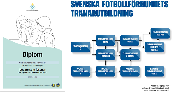 Ta chansen att inspireras och få tillgång till träningstips med lekar, färdighets- och spelövningar samt hela träningsprogram. Vi vill uppmuntra alla fotbollsledare att anmäla sig till förbundets utbildningar i höst/vinter, föreningen står för kostnaden! Läs mer om utbildningen och anmäl er på www.olff.se/tranarutbildning Tränarutbildning C Du som inte gått utbildning tidigare ska anmäla dig till den första nivån, Tränarutbildning C. Kursen passar tränare för alla åldrar, men inriktar sig särskilt till tränare för barn upp till och med 12 år. Efter genomgången utbildning får man en träningsoverall och en träningströja enligt föreningens klädpolicy. Kursen genomförs under två heldagar ca kl. 09:30-16:30 följande datum: 10/10 + 24/10, 2020 14/11 + 5/12, 2020 23/1 + 6/2, 2021 6/3 + 20/3, 2021 10/4 + 24/4, 2021 24/10 + 14/11, 2020 (för tjejer/kvinnor) Det finns även en Målvaktstränarutbildning C den 14/11 för den som vill lära sig mer om målvaktsträning. Tränarutbildning B Har du gått Tränarutbildning C finns det möjlighet att anmäla dig till nästa nivå, Tränarutbildning B Ungdom, som vänder sig till tränare för ungdomar i åldern 13-19 år. Kursen består av två block och totalt 4 kursdagar. Tänk på att anmäla dig till både Block 1 och Block 2, och i rätt ordning. Block 1 genomförs följande datum: 7-8/11, 2020 13-14/2, 2021 Block 2 genomförs följande datum 21-22/11, 2020 6-7/3, 2021 Några ledare i Hovsta IF är anmälda till B-kursen den 7-8/11 + 21-22/11 så passa på att anmäl dig! Läs mer om utbildningarna och anmäl er på www.olff.se/tranarutbildning eller fråga någon i styrelsen. Välj 'Föreningen betalar kursen' vid anmälan. Idrottsövergripande utbildningar RF-SISU erbjuder idrottsövergripande utbildningar inom de flesta områden, exempelvis inom ledarskap, kost, föreningsutveckling och idrottsskador. Föreningen betalar kostnaden även för deltagande i RF-SISU:s utbildningar. Läs mer på www.rfsisu.se/orebrolan eller besök följande kostnadsfria webbutbildningar: Vad innebär tränarrollen - konkreta tips kring ledarskap och träning: Länk (RF-SISU) Vad innebär rollen som föreningsledare - inspiration för ett spännande och viktigt uppdrag: Länk (RF-SISU) Ledare som lyssnar - om psykisk hälsa för dig som leder barn och unga på fritiden: Länk (Folkhälsomyndigheten) Hälsningar Fotbollssektionens styrelse
